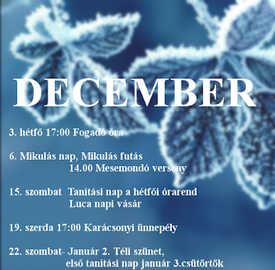 December 22. - Január 2. Téli szünet, első tanítási nap január 3.csütörtök
